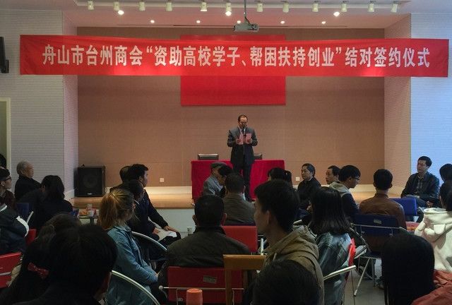 台州商会爱心助学11月26日下午,由舟山市台州商会发起的“资助高校学子、帮困扶持创业”结对签约仪式在浙江海洋大学举行。来自浙江海洋大学、国际海运学院、浙江旅游健康学院等三所高校的35名学生与23家企业签订了助学协议。来源:舟山市慈善总会 2016-11-30