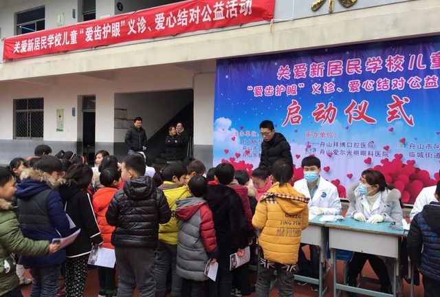 关爱新居民学校儿童义诊、爱心结对公益活动12月28日上午,在舟山市定海区育才学校一片热闹景象,由舟山市慈善总会、舟山市卫计局、舟山市教育局主办,舟山拜博口腔医院、舟山爱尔光明眼科医院和舟山市阿拉义工协会及临城街道城市驿站联合承办的关爱新居民学校儿童“爱齿护眼”义诊、爱心结对公益活动今天在这里举行。来源:舟山市慈善总会 2016-12-30 -