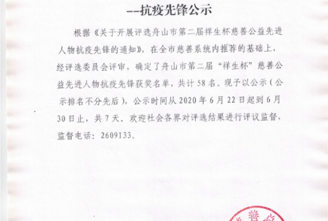 舟山市第二届“祥生杯”慈善公益先进人物 --抗疫先锋公示根据《关于开展评选舟山市第二届祥生杯慈善公益先进人物抗疫先锋的通知》,在全市慈善系统内推荐的基础上,经评选委员会评审,确定了舟山市第二届“祥生杯”慈善公益先进人物抗疫先锋获奖名单,共计58名。现予以公示(公示排名不分先后),公示时间从2020年6月22日起到6月30日止,共7天。欢迎社会各界对评选结果进行评议监督,来源:舟山市慈善总会 2020-06-24