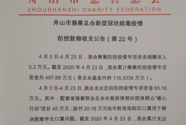 舟山市慈善总会新型冠状病毒疫情防控款物收支公告(第22号)4月3日-4月23日,我会筹集防控疫情专项资金捐赠收入0.3万元。截至2020年4月23日,我会累计筹集防控疫情专项资金共497.68万元(含总会基金内转118.3336万元)。来源:舟山市慈善总会 2020-04-24 -