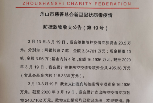 舟山市慈善总会新型冠状病毒疫情防控款物收支公告(第19号)3月13日-3月19日,我会筹集防控疫情专项资金23.5万元。分别为:网银转账7笔,金额3.34701万元;现金捐赠10笔,金额3.96万;基金内转4笔,金额16.1936万元。截至2020年3月19日,我会累计筹集防控疫情专项资金共495.38万元(含总会基金内转118.3336万元)。来源:舟山市慈善总会 2020-03-20 -