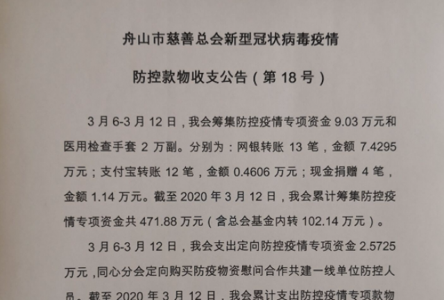 舟山市慈善总会新型冠状病毒疫情防控款物收支公告(第18号)3月6-3月12日,我会筹集防控疫情专项资金9.03万元和医用检查手套2万副。分别为:网银转账13笔,金额7.4295万元;支付宝转账12笔,金额0.4606万元;现金捐赠4笔,金额1.14万元。截至2020年3月12日,我会累计筹集防控疫情专项资金共471.88万元(含总会基金内转102.14万元)。来源:舟山市慈善总会 2020-03-13