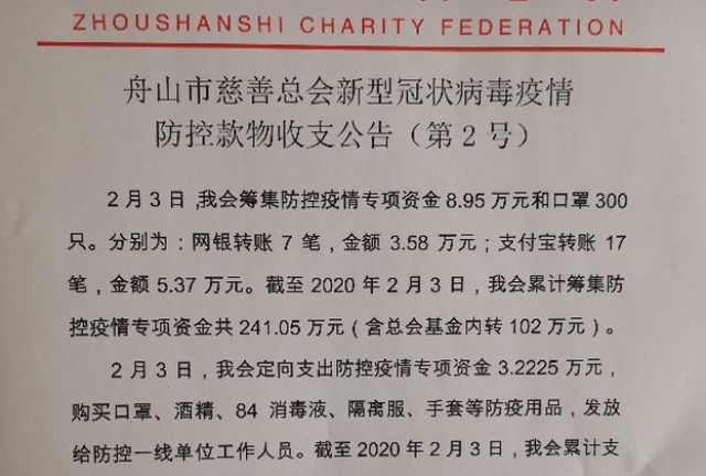舟山市慈善总会新型冠状病毒疫情防控款物收支公告(第2号)2月3日,我会筹集防控疫情专项资金8.95万元和口罩300只。分别为:网银转账7笔,金额3.58万元;支付宝转账17笔,金额5.37万元。截至2020年2月3日,我会累计筹集防控疫情专项资金共241.05万元(含总会基金内转102万元)。来源:舟山市慈善总会 2020-02-04 -