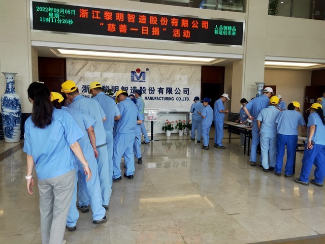 守望相助,扶危济困是中华民族的传统美德!团结互助,同舟共济是当今社会的时代风尚!浙江黎明智造股份有限公司积极响应舟山市委市政府关于开展2022年“慈善一日捐”活动的通知要求,在9月5日这天,组织开展了“慈善一日捐”活动。尽管当天恰逢台风天,风雨交加的天气也丝毫没有影响公司员工奉献爱心的热情。全体员工积极响应,依次将饱含爱心的捐款投入箱中,以实际行动践行了“乐善好施、行善积德、扶危济困”的传统美德,体现了企业支持社会慈善事业的奉献精神。