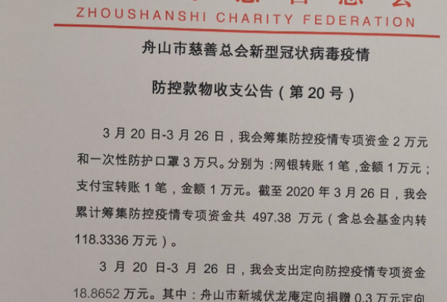 舟山市慈善总会新型冠状病毒疫情防控款物收支公告(第20号)3月20日-3月26日,我会筹集防控疫情专项资金2万元和一次性防护口罩3万只。分别为:网银转账1笔,金额1万元;支付宝转账1笔,金额1万元。截至2020年3月26日,我会累计筹集防控疫情专项资金共497.38万元(含总会基金内转118.3336万元)。来源:舟山市慈善总会 2020-03-27 -