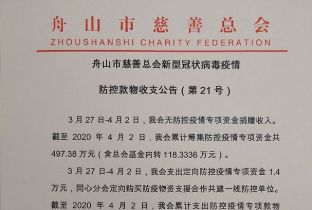 舟山市慈善总会新型冠状病毒疫情防控款物收支公告(第21号)3月27日-4月2日,我会无防控疫情专项资金捐赠收入。截至2020年4月2日,我会累计筹集防控疫情专项资金共497.38万元(含总会基金内转118.3336万元)。来源:舟山市慈善总会 2020-04-03 -