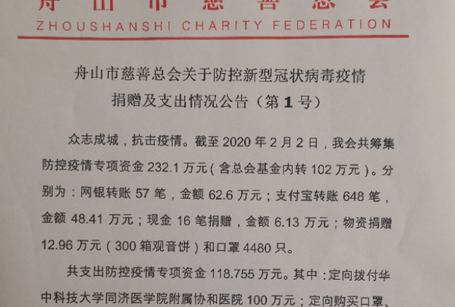 舟山市慈善总会新型冠状病毒疫情防控款物收支公告(第1号)截至2020年2月2日,我会共筹集防控疫情专项资金232.1万元(含总会基金内转102万元)。分别为:网银转账58笔,金额62.6万元;支付宝转账648笔,金额48.41万元;现金16笔捐赠,金额6.13万元;物资捐赠12.96万元(300箱观音饼)和口罩4480只。来源:舟山市慈善总会 2020-02-03 -